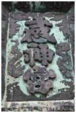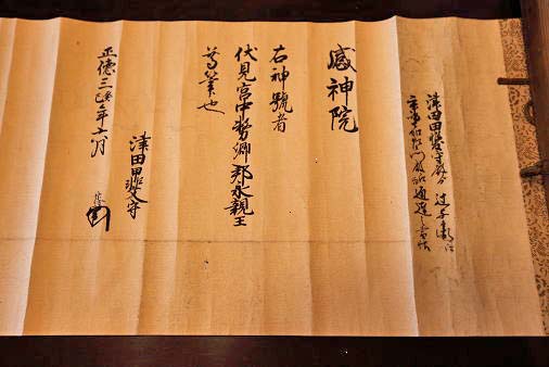 この額字は昔(明治時代前)は「感神院」とありました。この神社のご神号として、正徳3年(1718年)、伏見宮邦永親王(1676~1726)のご尊筆による「感神院」を賜ったことが氏子中の旧家に保存されている古文書に記されています(上の写真)。額の細工は、大坂金田町(現在の大阪市中央区博労町あたり)の「錺屋 五左衛門」によるとの銘があります。