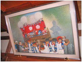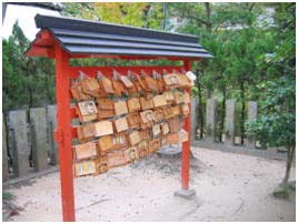 近年は絵馬を奉納する習慣は昔ほど盛んでないように思われます。当神社では昭和57年に奉納された太鼓神輿図(日本画家 中畑有宏筆)の絵馬(というより単なる絵画というべきかも知れません。)があります(写真1)。これはタテ・ヨコ107×162センチの大きなものですが、近年奉納された絵馬の額はこの1点だけです。今は、社頭で授与したり、ご祈祷の撤下品(お下がり)に含めてお渡ししたりするミニ絵馬(写真2)がもっぱらです。これに祈願を書いて境内の絵馬掛(写真3)にかけてもらいます。絵馬掛はどこの神社へ行ってもよく見かけます。