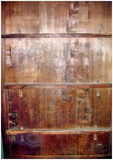 ところが、平成5年の太鼓神輿の修復調査に際し、吹田市立博物館の学芸員の方が太鼓神輿を調査した際、その傍らに積まれていた前記の古絵馬に気付かれ、そのすべてを運び出して1点ずつ写真に収められました。このとき、私は初めて古絵馬の状況を知ることができました。一部破損、虫食い、絵柄の剥落等、保存状況は甚だよくありませんでした。博物館では現拝殿に収められた5点を併せ全部を資料化され、当神社にその調査カードと写真をいただきました。その内容をまとめて末尾の別紙1に示します。最も古いものが寶永元?年(1704年)の「奉納俳諧五十句額」です(写真9)。最も新しいものが大正3年(1914年)です。大きさは大小さまざま、絵柄もさまざまです。文字は奉納時の年号、奉納の趣旨などが読めるものがいくつかあります。その中で白眉は「張翼徳図」です(写真10~12)。これは項を改めて紹介することにします。