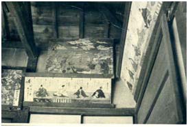 ところで、当神社には江戸時代中期から明治・大正時代までに奉納された大小さまざまの古い絵馬20数点が残されています。これらは、旧拝殿(元禄16年から昭和43年)の内壁面に飾られていたものです。その一部が写っている写真があります(写真4)。この写真には三十六歌仙図の絵馬の一部のほか、剥落の著しい絵馬が見えます。これらの絵馬を当神社では「古絵馬」と呼ぶことにしていますが、そのほとんどが剥落し、絵柄が分らないか、一部が分る程度のものです。