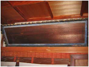 剥落(中)破損(中)旧拝殿内の掲額状態の写真(写真1)。